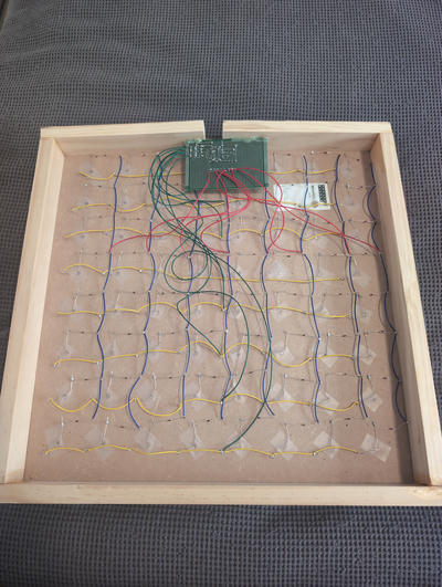 The wiring is fairly straightforward if you have experience with basic soldering skills. It follows a simple matrix wiring structure. I started with placing photoresistors in each of the holes that I drilled. Then I soldered diodes to one end of each photoresistor. Then solder a wire that is connected to each diode for the rows and a wire that is connected to each photoresistor for the columns. You will then get something that looks like this.